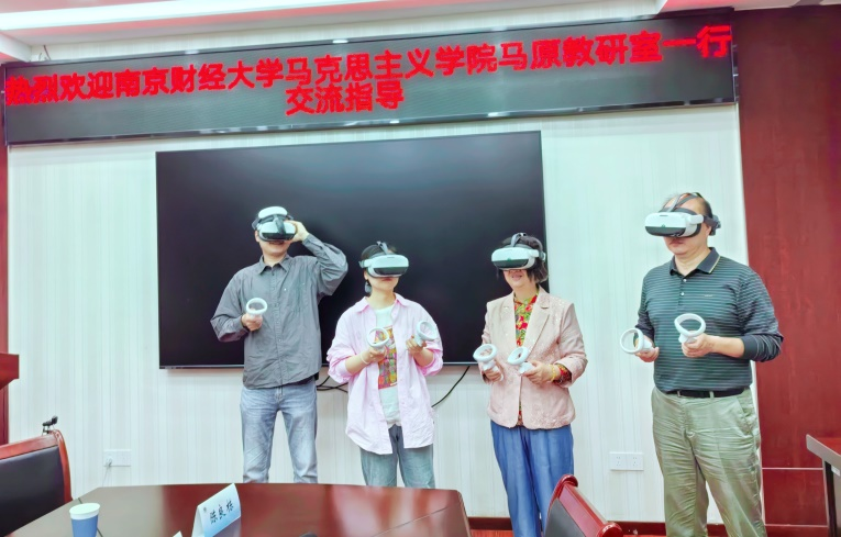 实践教学VR展厅,开展现场实践交流学习活动。在展厅内,相关负责人详细介绍了VR实践教学的开发理念、课程设计以及实施效果。调研团队亲身体验了VR技术在马克思主义理论实践教学中的应用。