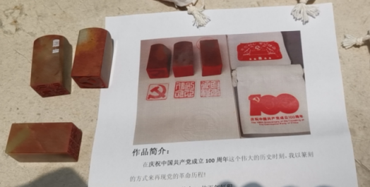 本次画展紧紧围绕庆祝“建党100周年”的宏大主题,以党史中的标志性事件为素材,以篆刻、书法、绘画等形式,再现了中国共产党百年奋斗征程中的光辉时刻。画龙点睛般地讴歌了中国共产党百年以来的伟大成就。同时,本次画展也是依照学院制定的“一主多辅的模块教学法”,秉持理论教学和实践教学一体谋划、一体考核的原则,对思政课实践教学模式的一次探索和创新。