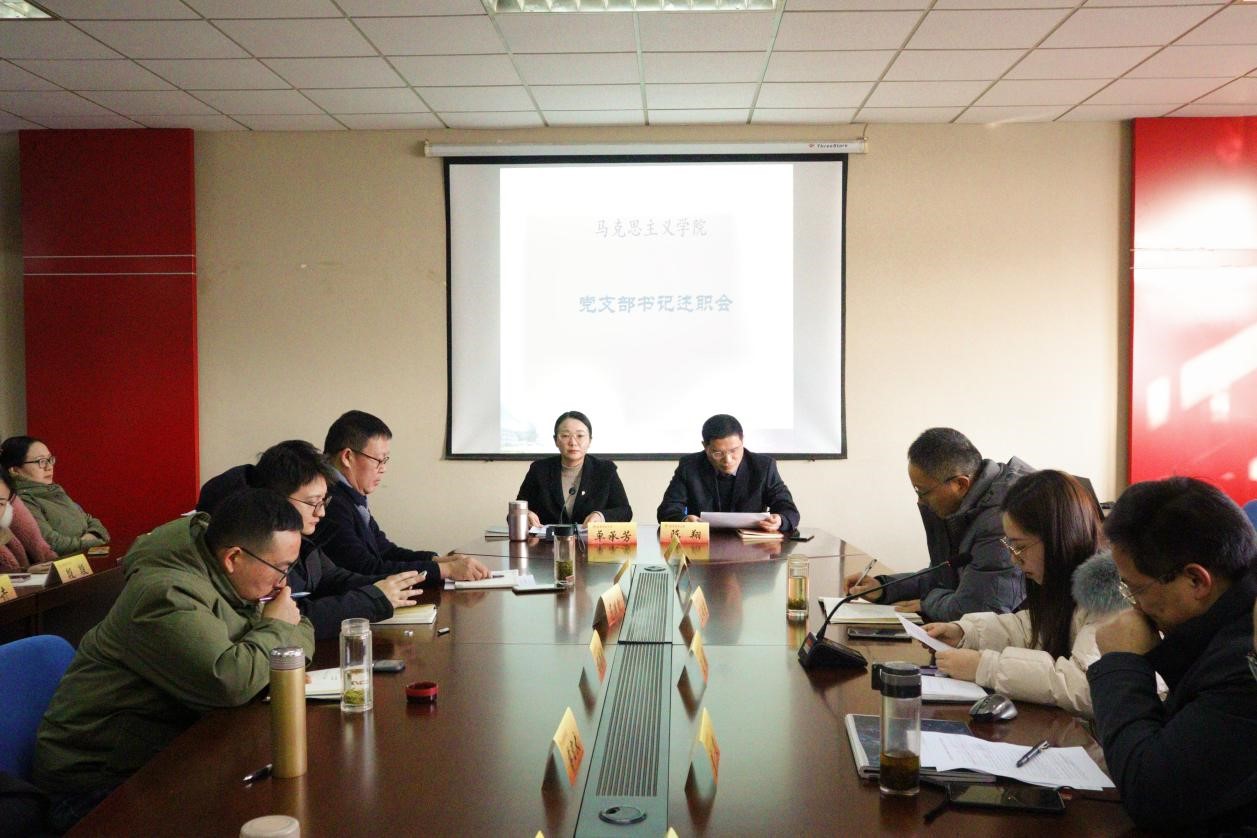 在德正楼508会议室召开全院教职工大会,马克思主义学院党委书记陈翔、院长卓承芳,副院长刘希刚、副院长王敏光、院长助理范渊凯和全体教师参加会议,会议由陈翔书记主持。本次教职工大会共分为四项议程。