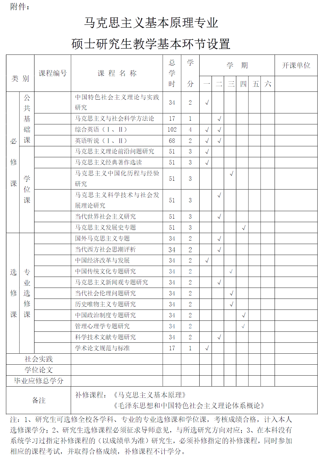 注:每位硕士研究生必须按照各教学基本环节规定的学分进行必修或选修,且每一环节的学分不得用其它环节的学分替代,修满的总学分为45。