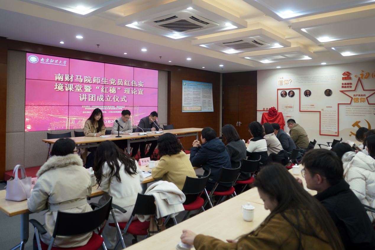 南财马院学生代表朱传仿、王军结合讲解分享学习感悟,教师党员李飞现场点评补充,让在场人员深刻领会到这一思想的历史根基与现实价值,也为后续理论宣讲筑牢了实践基础。