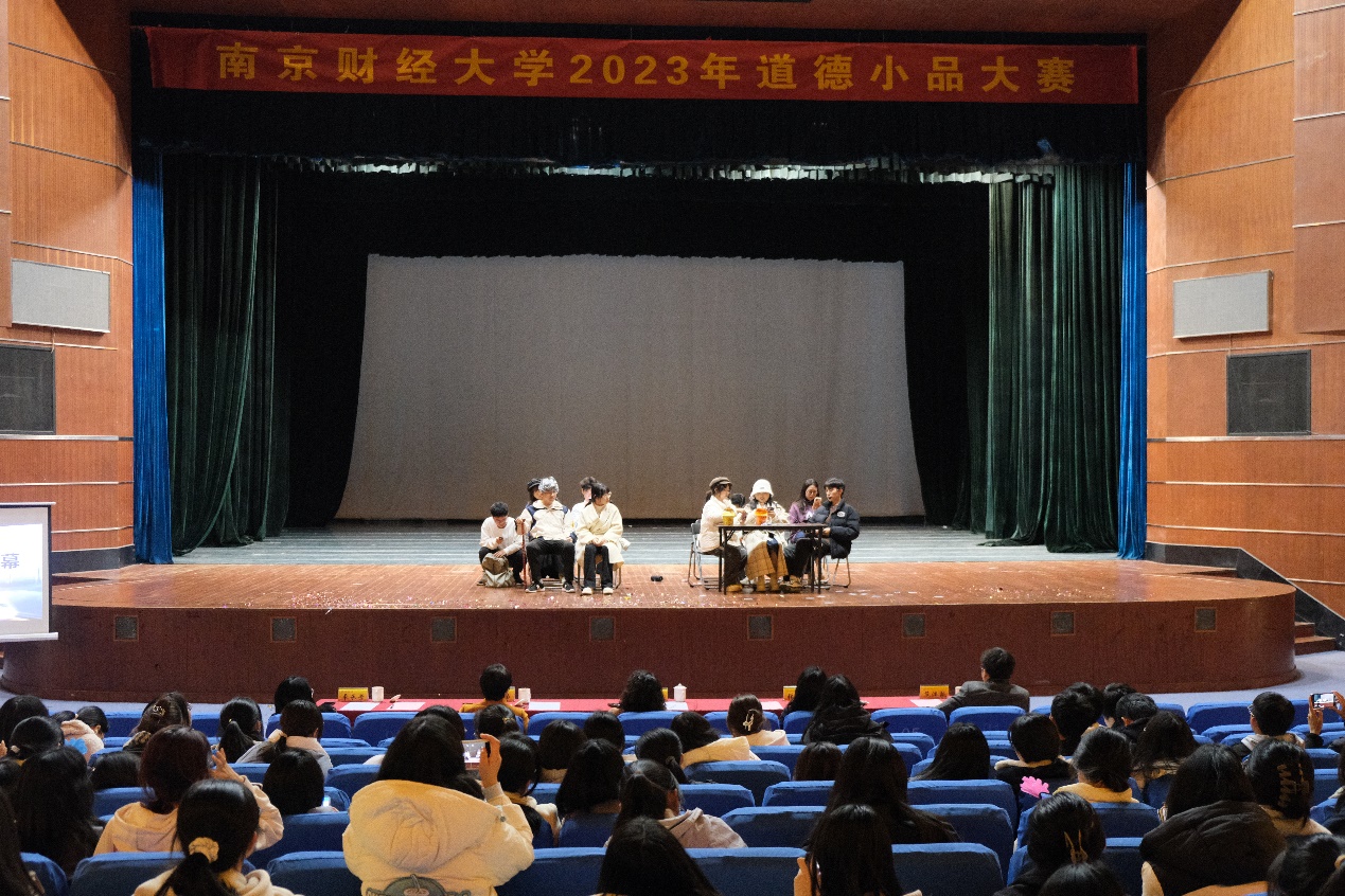 比赛中,同学们将网络暴力、电信诈骗、高铁占座等社会热点问题搬上舞台,旨在教育大学生们养成良好的道德品质、树立健全的法治意识。在近两个小时的赛程中,8组小品精彩纷呈,全场座无虚席,气氛热烈,掌声、笑声此起彼伏。经过激烈的角逐,国际经贸学院《华山论“键”》获一等奖,营销与物流管理学院《眼见为实》、食品科学与工程学院《尔虞我诈》获二等奖,财政与税务学院《恶语难掩糖水甜》、金融学院《高铁“趣”闻》、公共管理学院《道德英雄》获三等奖,工商管理学院《宿舍风波2.0》、应用数学学院《枪手与小徐》获优秀奖。
