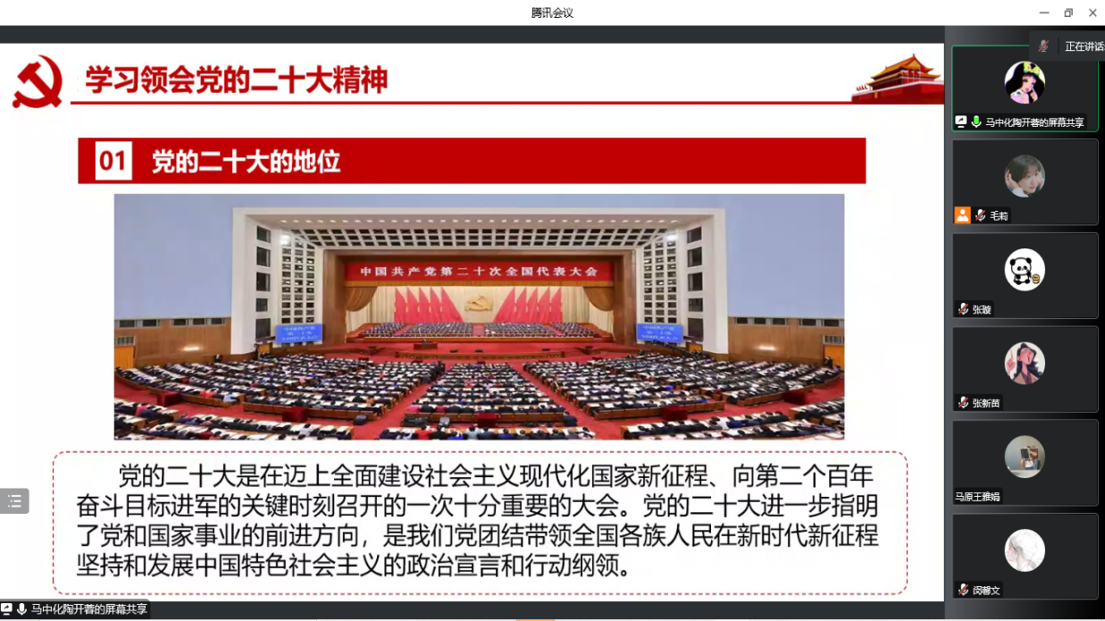 为深入学习贯彻党的二十大精神,进一步增强广大党员的党性修养,10月26日,研究生党支部以腾讯会议的形式召开党的二十大报告专题学习会。会议由党支部书记毛莉同志主持,支部委员陶开蓉同志领学。