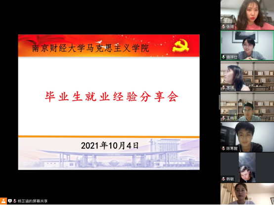2021级全体研究生以及2020级部分研究生在云端相聚,召开“就业经验线上分享会”。会议邀请姜子悦、王畅宇、常琪、陈寒醒等四位优秀毕业生代表,就考博、求职方面进行经验分享。会议由学院研究生会主席骆祥慧主持。