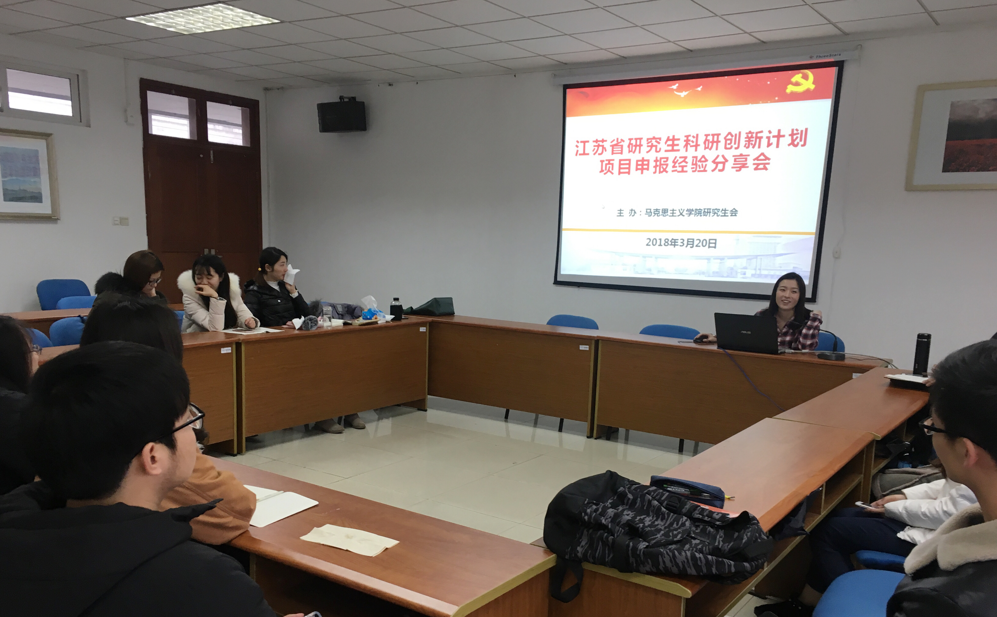 于学院会议室举办了“2018年度江苏省研究生科研创新计划项目”申报经验分享会。会议邀请2016级成功申报省立省助项目的莫菲、彭见欢、彭婷、屈文锦四位同学担任主讲,2017级意向申报省级课题的同学参加了会议,会议由91porny